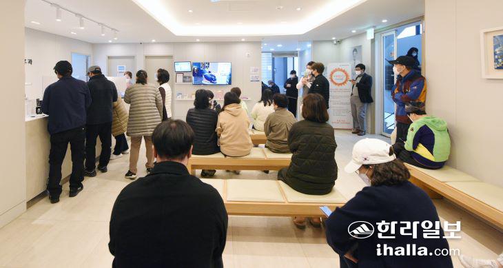 14일 제주시의 한 호흡기 진료 지정 의료기관에 신속항원검사를 받으려는 환자들이 몰려 북적이고 있다. 이상국기자