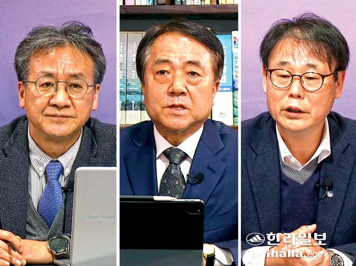 왼쪽부터 박원배 제주지하수연구센터장, 김태윤 제주와미래연구원 수석연구위원, 양덕순 제주대학교 행정학과 교수.