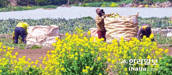 16일 서귀포시 대정읍 하모리 한 농경지에서 농민들이 유채꽃을 배경으로 무 수확 작업을 하고 있다. 강희만기자