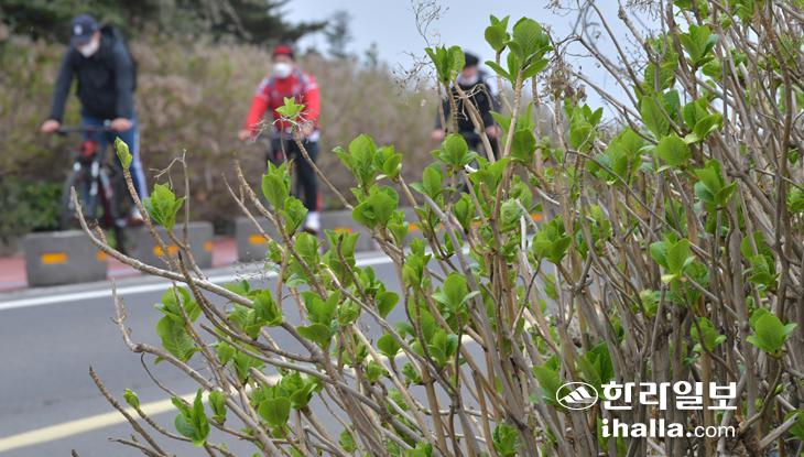 17일 제주시 구좌읍 종달리 해안도로변의 수국에 초록색 새싹이 올라와 봄소식을 전하고 있다. 강희만기자