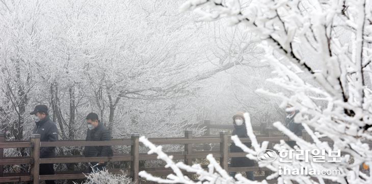 20일 제주지역 기온이 갑자기 떨어진 가운데, 1100고지를 찾은 관광객들이 아름답게 피어 난 상고대를 배경으로 사진을 촬영하며 추억을 새기고 있다. 이상국기자