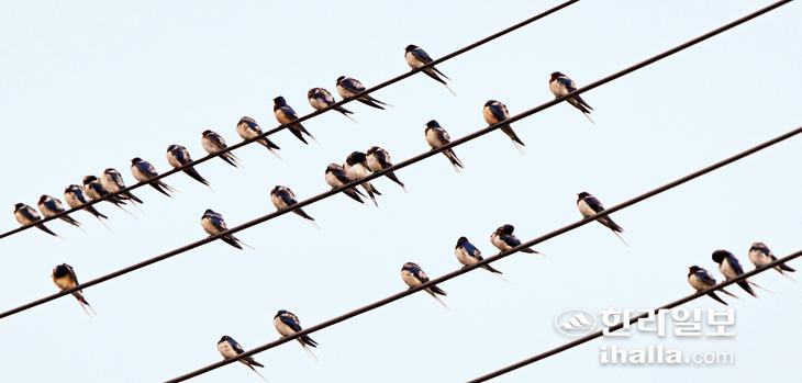 동남아시아 등지에서 월동을 마친 제비들이 한반도로 돌아오는 도중 19일 제주시내 한 전깃줄에 앉아 휴식을 취하고 있다. 강희만기자