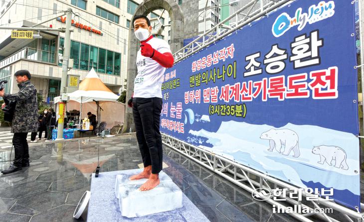 ‘얼음 위 맨발로 오래 서 있기’ 세계기록 보유자인 조승환씨가 20일 제주시 연동 누웨마루거리에서 열린 CFI 2030 정책 홍보 캠페인에서 얼음 위 서 있기 3시간35분을 버텨 기네스북 세계기록을 경신했다. 이상국기자
