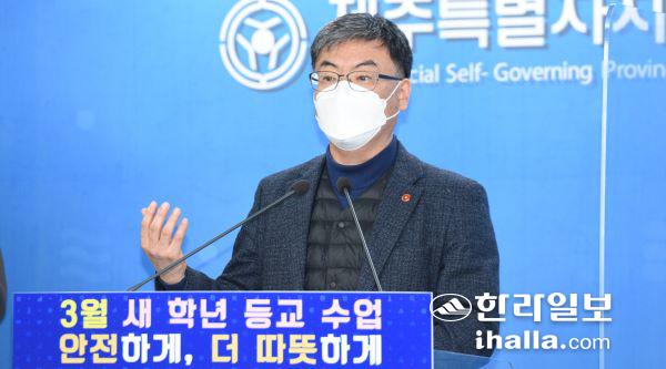 김영관 제주도교육청 학생인권교육센터장이 21일 도교육청 기자실에서 최근 이뤄진 도내 A고 학생인권침해실태 기자회견과 진정서 제출에 대한 후속조치를 발표하고 있다. 이상국기자