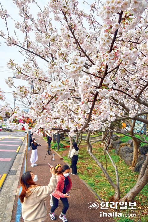 절기상 춘분인 21일 제주시 내도동 도로변 벚나무에 벚꽃이 활짝 펴 봄소식을 전하고 있다. 강희만기자