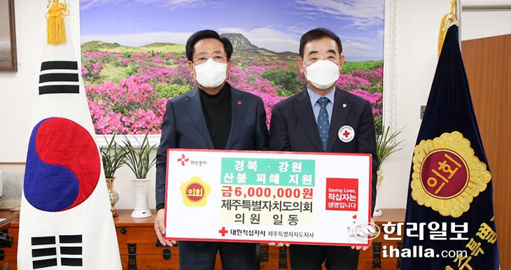 제주특별자치도의회(의장 좌남수)는 21일 경북·강원 지역 산불 피해를 입은 주민들을 위해 써달라며 대한적십사자 제주지사에 성금 600만원을 전달했다.