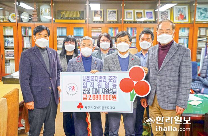 사회복지법인 춘강(이사장 이동한) 임직원 일동은 지난 18일 춘강 법인 사무실에서 강원·경북지역 산불피해 지원을 위한 성금 268만원을 제주사회복지공동모금회(회장 강지언)에 기부했다.
