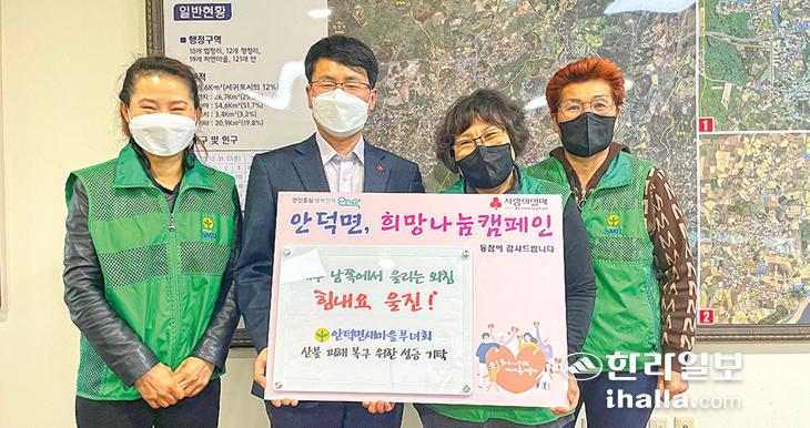 서귀포시 안덕면새마을부녀회(회장 강복덕)는 지난 18일 최근 경상북도 울진에서 발생한 산불로 피해를 입은 주민을 위해 성금 100만원을 기탁했다. 강복덕 부녀회장은 "갑작스런 산불로 힘든 시간을 보내는 주민들에게 위로의 마음을 보태고자 부녀회원들과 함께 성금을 모았다"고 전했다.