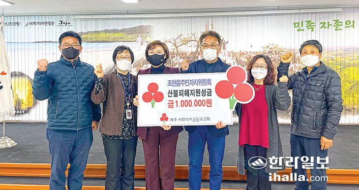 제주시 조천읍 주민자치위원회(위원장 김보홍)는 지난 18일 경북·강원 지역 산불 피해를 입은 지역민 구호를 위해 성금 100만원을 사회복지공동모금회에 전달했다. 김보홍 위원장은 "산불로 피해를 입은 지역민에게 조금이나마 도움이 될 수 있기를 희망한다"고 했다.