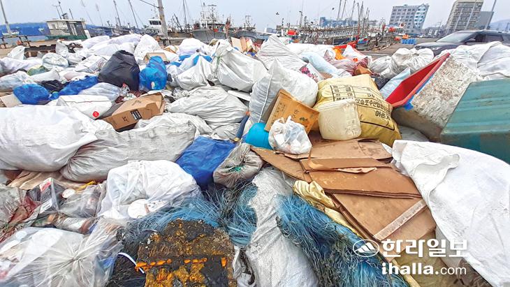 서귀포시 대정읍 모슬포항에 어선에서 나온 폐어구들이 산더미처럼 쌓여 눈살을 찌푸리게 한다. 강희만기자