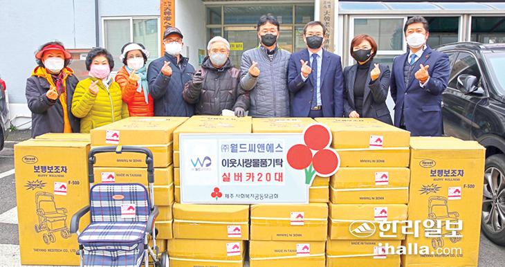 사회적기업 (주)월드씨앤에스(대표 김용광)는 지난 21일 제주시 연상동경로당에서 실버카 20대를 제주사회복지공동모금회에 기탁했다. 물품은 연상동경로당 관내 어려운 노인들에게 전달될 예정이다.