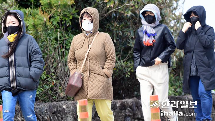 꽃샘추위가 기승을 부린 22일 제주시 한경면 해안도로를 찾은 관광객들이 두꺼운 겨울 외투를 입고도 추위를 느끼는지 움츠린 채로 걸음을 옮기고 있다. 강희만기자