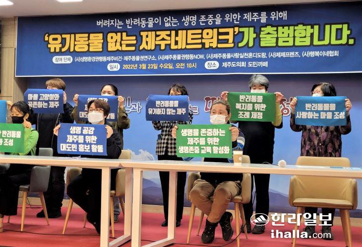 '유기동물 없는 제주네트워크'가 23일 제주도의회에서 출범식을 열고 기자회견문을 낭독하고 있다. 김도영기자