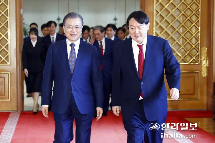 검찰총장 임명 당시 청와대에서 만난 문재인 대통령과 윤석열 당선인. 연합뉴스