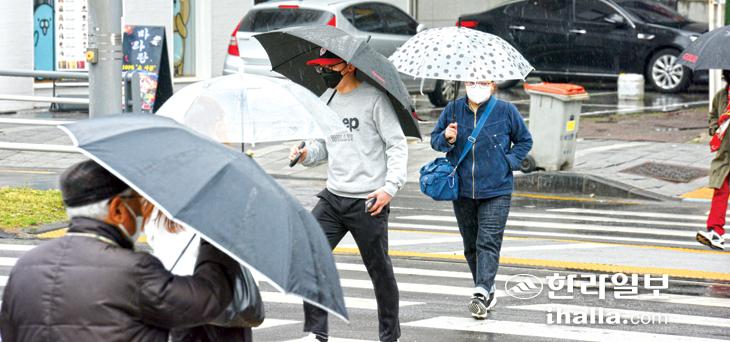 비가 내린 23일 제주시청 앞을 지나는 시민들이 우산을 쓴 채 발걸음을 재촉하고 있다. 이상국기자