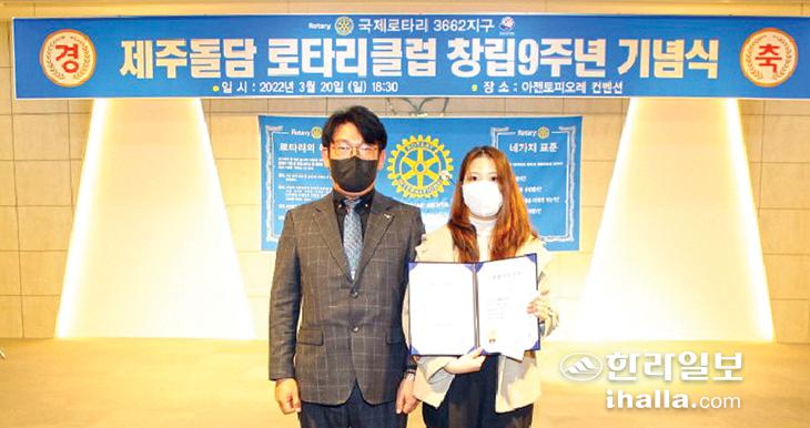 국제로타리3662지구 제주돌담 로타리클럽(회장 양우남)은 지난 20일 창립9주년 기념 행사를 열고 학생들이 지역 인재가 될 수 있도록 한국로타리장학문화재단 2022년도 1학기 관명장학금(한라대 간호학과), 클럽장학금(국제대 건축학과, 공연예술학과), 클럽자체 장학금(한림중, 신엄중) 등 총 300만원을 전달했다.
