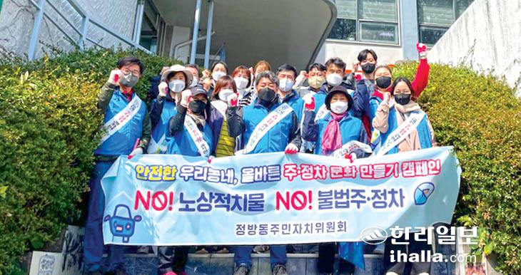 서귀포시 정방동과 정방동주민자치위원회(위원장 한동철)는 23일(수) 정방동 동부로 일대에서 안전한 동네 조성을 위한 올바른 주정차 문화 만들기 캠페인을 실시했다. 캠페인은 도시미관을 저해하고 있는 불법 노상적치물 치우기, 서로 배려하는 주차 문화 조성하기 등을 주요 내용으로 진행됐다.