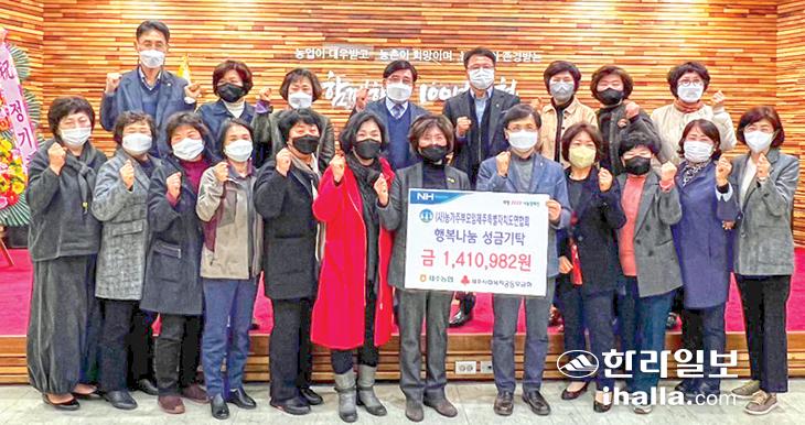 (사)농가주부모임 제주도연합회(회장 고순희)는 지난 23일 농협제주지역본부 대회의실에서 정기총회를 개최하고 제주사회복지공동모금회(회장 강지언)에 지난 한해 회원들이 모금한 행복나눔성금 140만원을 기탁했다.