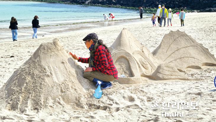 24일 제주시 함덕해수욕장에서 한 모래조각가가 모래조각 작품을 선보여 관광객들의 눈길을 끌고 있다. 강희만기자