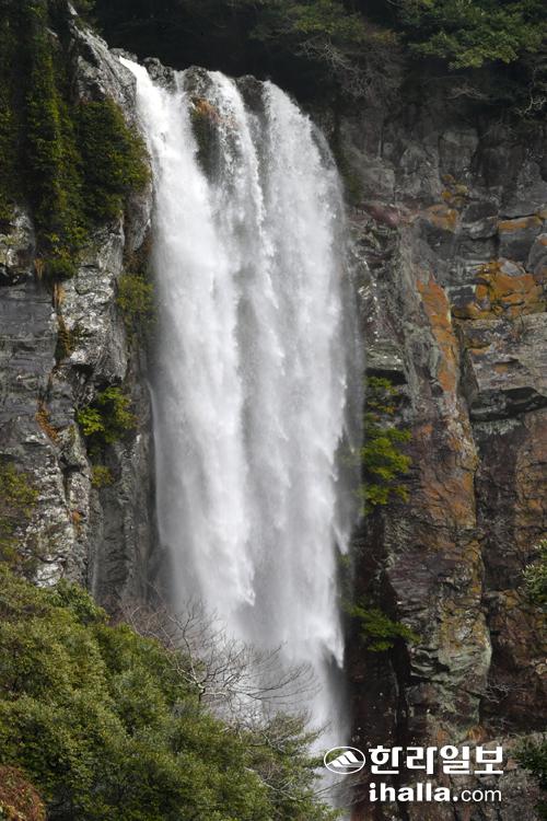 제주 전역에 많은 비가 내린 지난 26일 서귀포시 엉또폭포에 폭포수가 떨어지며 장관을 연출하고 있다. 강희만기자