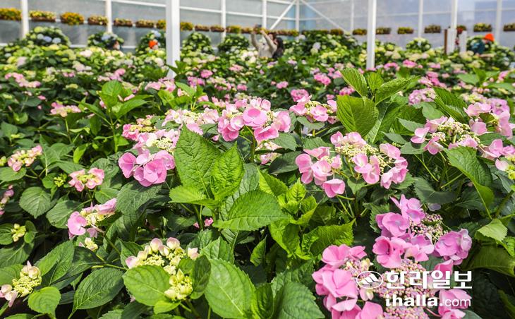 27일 제주 서귀포시 남원읍 휴애리자연생활공원을 찾은 입장객이 활짝 핀 수국을 배경으로 사진을 찍고 있다. 연합뉴스