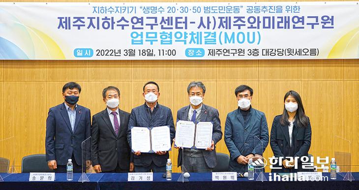 제주연구원 제주지하수연구센터(센터장 박원배)와 (사)제주와미래연구원(이사장 김기성)은 최근 제주지하수연구센터에서 업무 협약식을 갖고 지하수를 보전하기 위한 '생명수 20·30·50범도민 운동'을 공동으로 추진 및 상호협력을 통해 물 정책연구 활성화에 앞장서기로 했다.