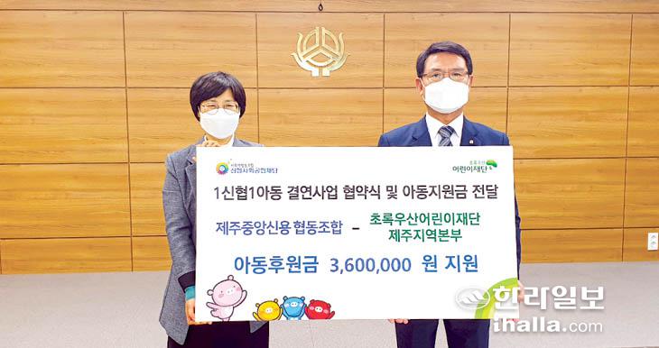 제주시 이도2동에 위치한 제주중앙신용협동조합(이사장 김태용)은 지난 25일 초록우산 어린이재단 제주지역본부(본부장 박정숙)가 진행하는 '1신협1아동 결연사업'에 동참하고 협약 및 후원금 전달식을 진행했다.
