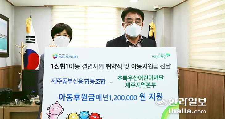 제주동부신용협동조합은 지난 28일 초록우산 어린이재단 제주지역본부와 함께 진행하는 '1신협1아동 결연사업'에 동참하고 협약 및 후원금 전달식을 진행했다. 협약을 통해 제주동부신협은 지역 내 도움이 필요한 아동 1명과 결연해 성인이 될 때까지 지원할 예정이다. 이를 위해 매월 10만원을 정기 후원, 연 120만원의 후원금을 지원하기로 했다.
