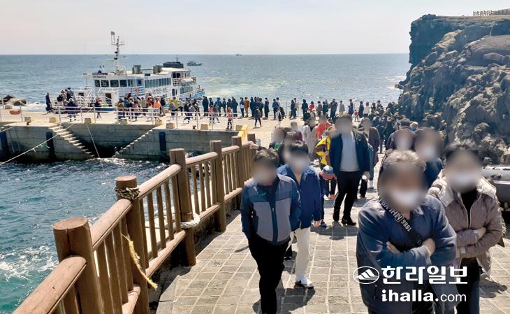 4월 첫 주말인 지난 2일 국토 최남단인 서귀포시 대정읍 마라도를 찾은 관광객들이 유람선에서 내려 관광에 나서고 있다. 강희만기자