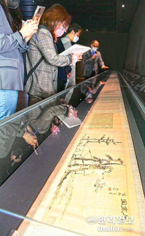 178년 만에 탄생지 제주에서 추사 김정희의 '세한도'(국보)를 만나는 특별전 '세한도, 다시 만난 추사와 제주'가 오늘부터 열린다. 전날인 4일 국립제주박물관에서 진행된 언론공개회에서 약 15m에 달하는 세한도 두루마리의 전모가 드러났다. 강희만기자