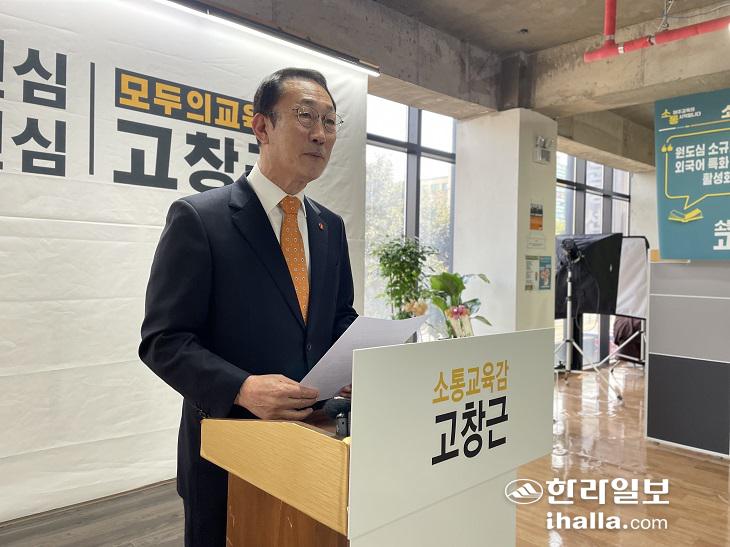 고 예비후보는 5일 제주시 이도2동 소재 선거사무소에서 기자회견을 열고 "2개 이상의 언론사 여론조사를 합산해 단 0.1%라도 앞선 후보를 단일후보로 선출하자"고 김 예비후보에게 제안했다. 송은범기자