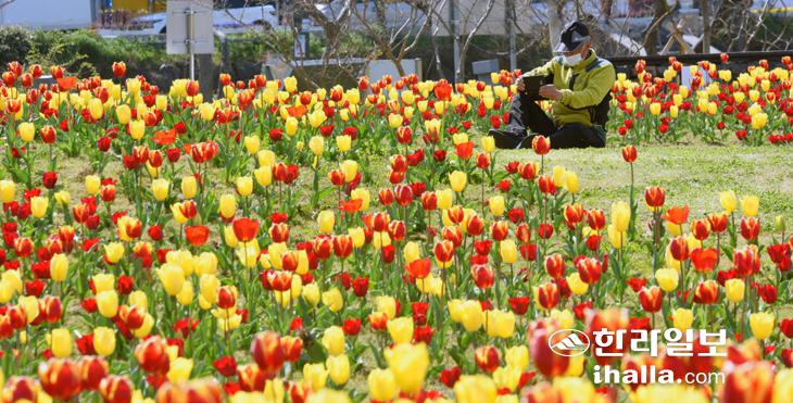 5일 제주시 건입동 산짓물공영주차장에 튤립 수천송이가 만개해 시선을 끌고있다. 이상국기자