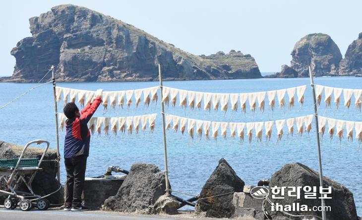 6일 제주시 한경면 자구네포구에서 한 상인이 오징어말리기 작업을 하고 있다. 이상국기자