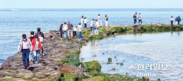 6일 제주시 이호테우해수욕장을 찾은 관광객들이 원담 위에서 봄 바다의 정취를 만끽하고 있다. 이상국기자
