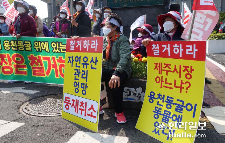 제주동부하수처리장 철거 월정리 비상대책위원회(이하 월정리 비대위)는 7일 제주도청 앞에서 기자회견을 열고 "용천동굴 역사문화환경에 있는 동부하수처리장은 문화재보호법 36조항의 건축허가 대상이 아니므로 즉각 철거하라"고 말했다.