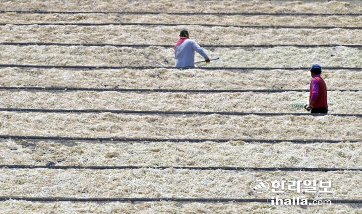 7일 서귀포시 성산읍 수산리 소재 한 영농조합에서 제주에서 수확한 무로 만든 무말랭이를 말리고 있다. 강희만기자