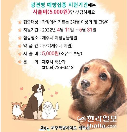 제주시가 4월 11일부터 5월 31일까지 3개월령 이상의 반려동물에 대한 광견병 예방접종을 지원한다.