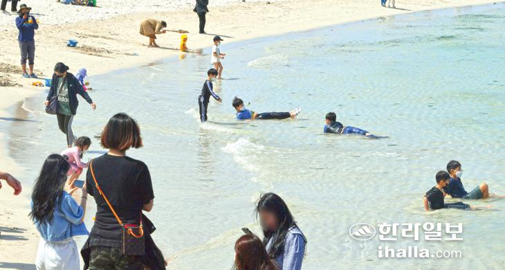 낮 최고기온이 20℃를 웃돈 11일 제주시 협재해수욕장을 찾은 관광객들이 물놀이를 하며 즐거워하고 있다. 강희만기자