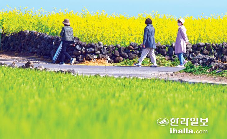 완연한 봄날씨를 보인 11일 제주를 찾은 관광객들이 제주시 이호동 청보리와 유채꽃밭 사잇길을 산책하고 있다. 강희만기자