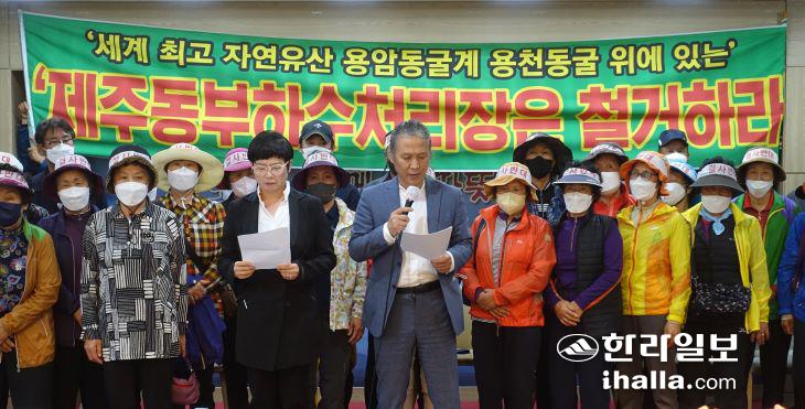 동부하수처리장 철거를 위한 월정리 비대위와 주민들이 12일 기자회견을 열고 관련 사안에 대한 유네스코 자연유산위원회 제소 입장을 밝히고 있다. 김도영기자