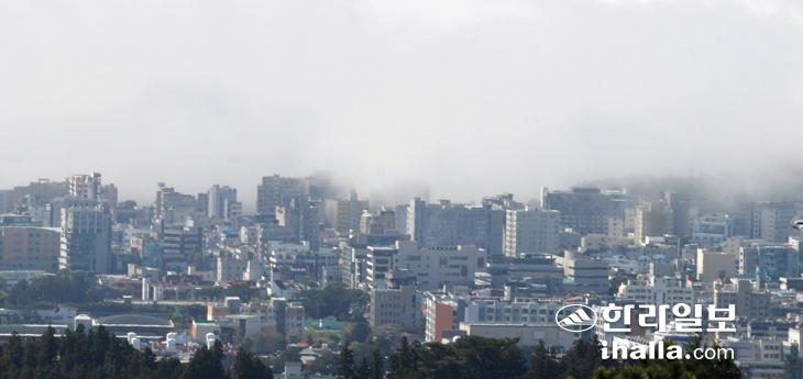 12일 오전 서귀포시 시가지에 짙은 안개가 서서히 밀려들고 있다. 강희만기자