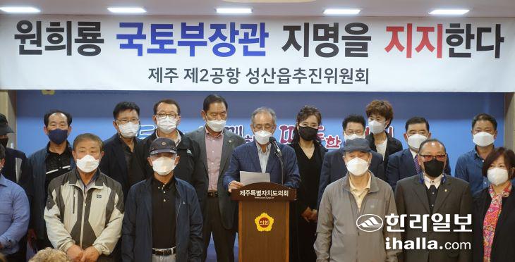 제2공항 성산읍 추진위원회 관계자들이 13일 기자회견을 열고 원희룡 국토부 장관 지명자에 대한 환영의 입장을 피력했다. 김도영기자