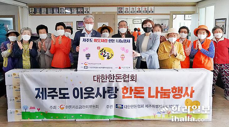 대한한돈협회 제주특별자치도협의회(회장 김재우)는 지난 13일 제주시 애월읍 봉성리경로당에서 '제주도 이웃사랑 한돈 나눔행사'를 갖고 한돈 2000㎏(2220만원 상당)을 제주사회복지공동모금회(회장 강지언)에 기탁했다. 이번 물품은 대한한돈협회 제주특별자치도협의회에서 지역사회 어려운 이웃들의 건강관리를 위해 마련한 것으로, 도내 경로당 13개소로 전달됐다.