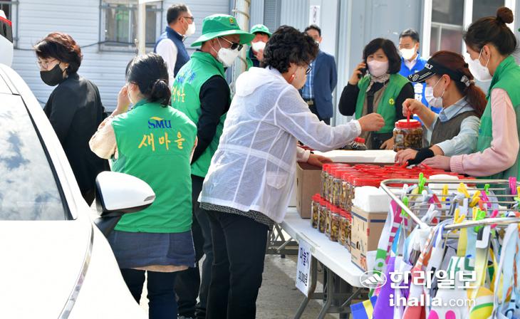 도두동새마을부녀회는 19일 제주시 도두동 오래물광장에서 드라이브스루 사랑나눔바자회를 진행했다. 강희만기자