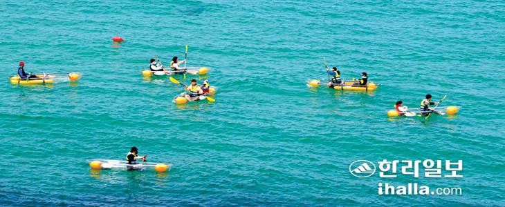 19일 제주시 애월읍 한담 해변을 찾은 관광객들이 투명카약을 타고 제주의 푸른 바다를 누비며 즐거운 시간을 보내고 있다. 강희만기자