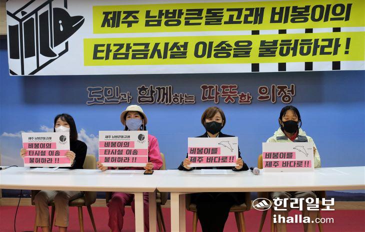 핫핑크돌핀스 외 7개 시민사회 단체는 21일 제주도의회에서 남방큰돌고래 비봉이의 방류를 촉구하는 기자회견을 열었다. 김도영기자