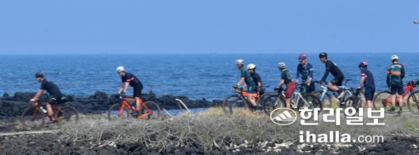 24일 제주시 한경면 해안도로에 자전거를 이용해 제주 관광에 나선 라이더들이 봄바다를 한것 느끼며 질주하고 있다. 강희만기자