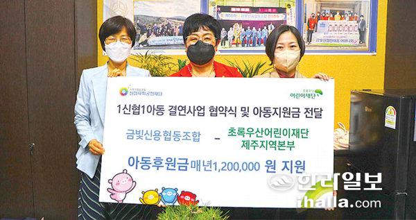 제주시 애월읍에 위치한 금빛신용협동조합(이사장 박여숙)은 지난 20일 초록우산 어린이재단 제주지역본부(본부장 박정숙)와 함께 진행하는 '1신협1아동 결연사업'에 동참하고 협약 및 후원금 전달식을 진행했다.