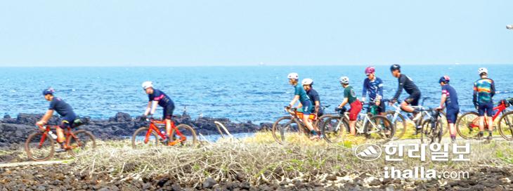 24일 자전거를 이용해 제주 관광에 나선 라이더들이 봄바다에서 불어 오는 해풍을 맞으며 제주시 한경면 해안도로를 질주하고 있다. 강희만기자