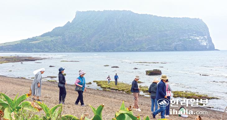 주말인 지난 23일 서귀포시 성산읍 광치기해변에서 관광객들이 바다를 배경으로 기념사진을 찍고있다. 이상국기자